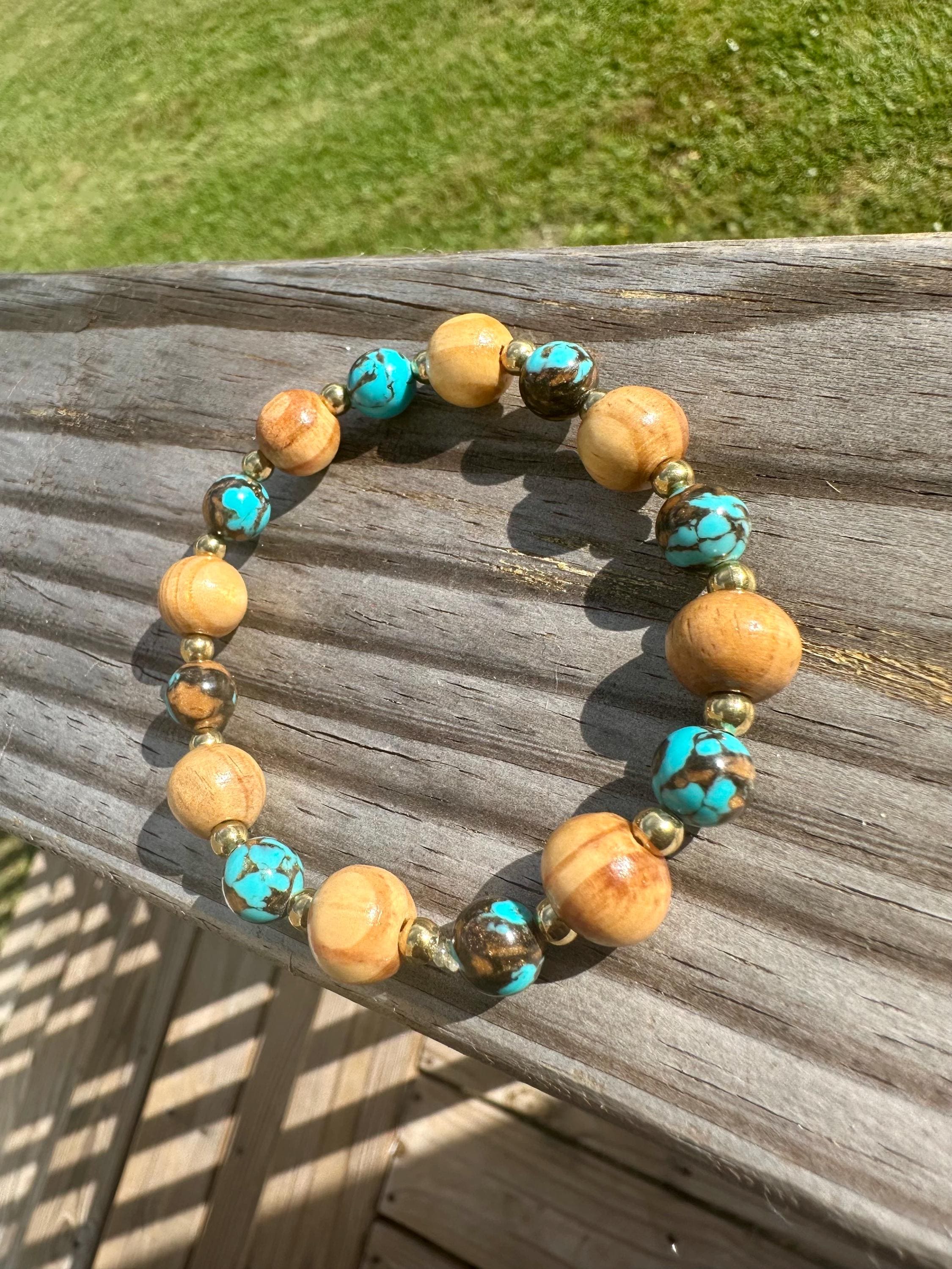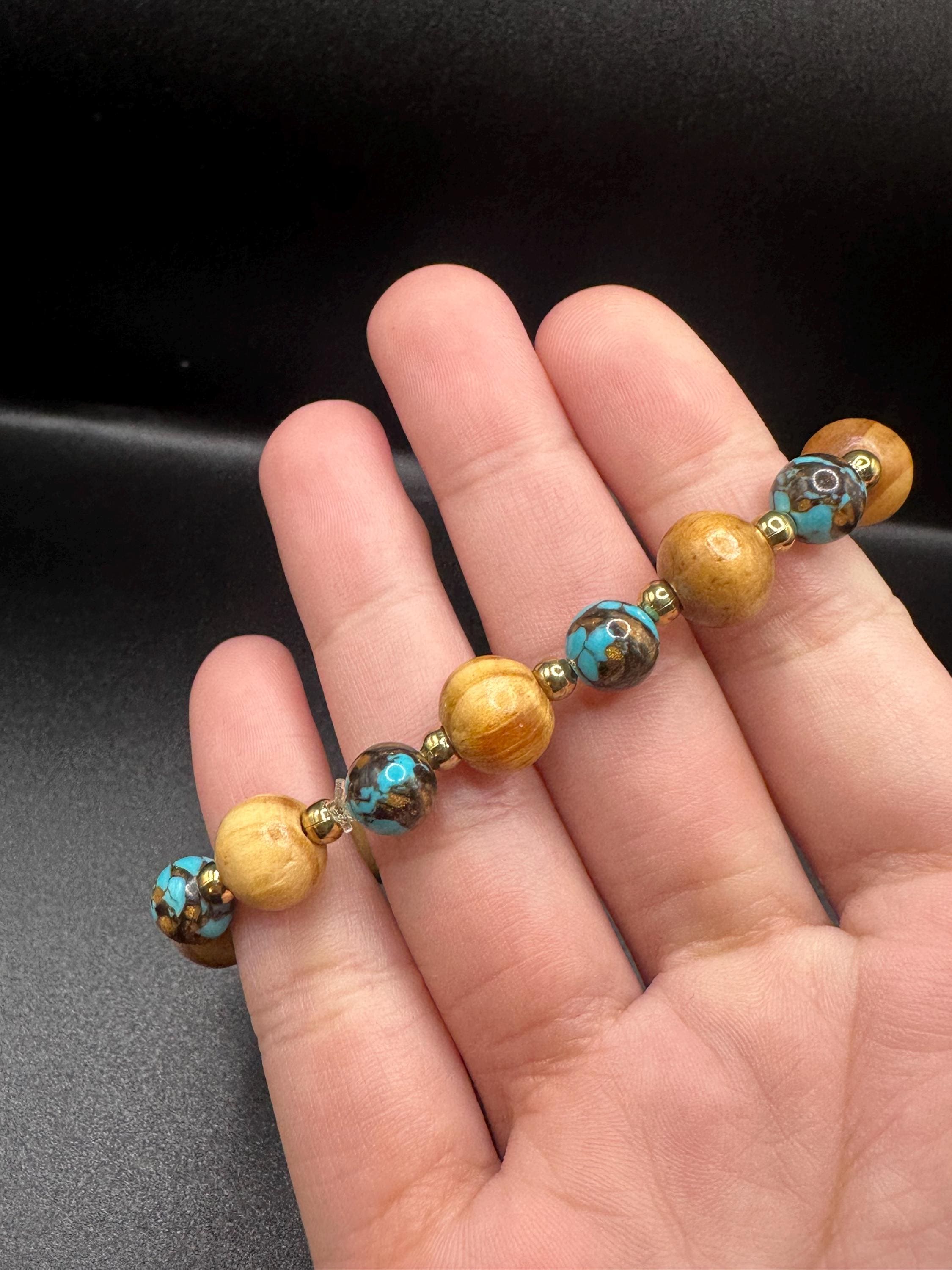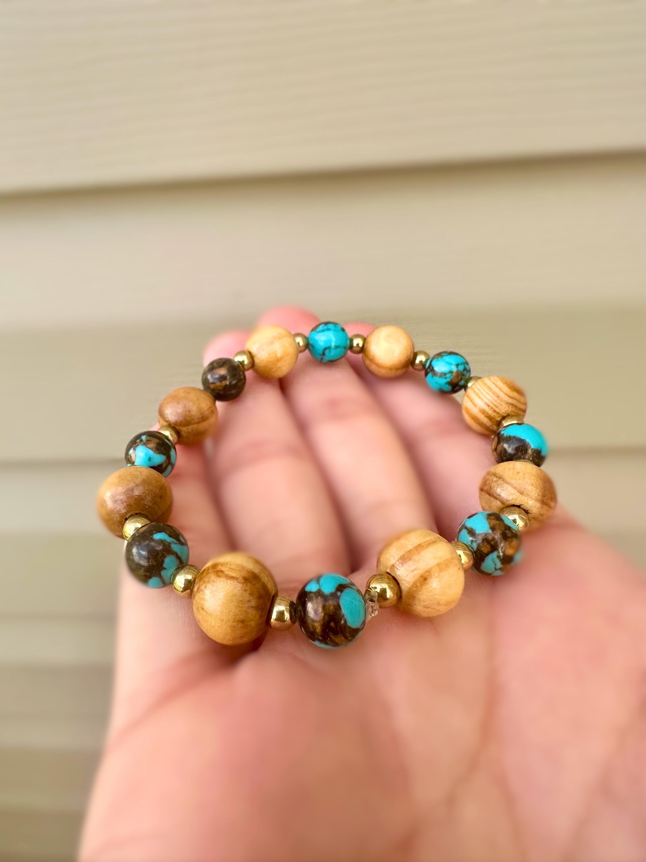 All pieces are handmade and should be handled with care. We recommend rolling on your bracelets, rather than pulling them on/off as they are not meant to significantly stretch and will loosen if so. Please be advised that metals and beads will naturally tarnish and fade over time when exposed to body oils and other natural elements. We recommend removing your jewelry before bathing, swimming, and before going to bed to discourage accelerated tarnish.
